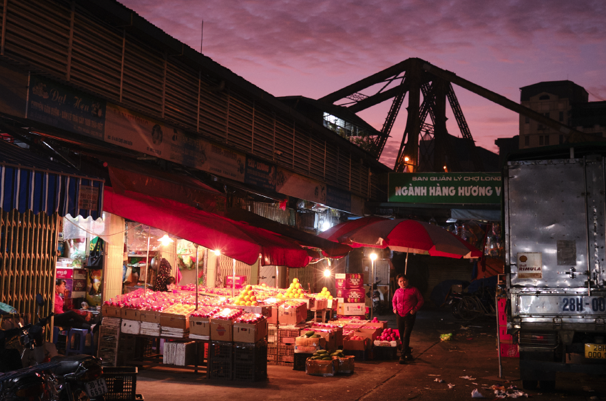 Hanoi’s Long Biên wholesale market sits beneath the old French colonial bridge of the same name and it runs on a schedule that has nothing to do with the sun. By midnight the first vendors are already staking out their positions on the concrete. Within two hours, the place is fully alive — a roaring, steaming, cacophonous ecosystem of commerce that will be mostly packed up before most of Hanoi pours its first coffee.