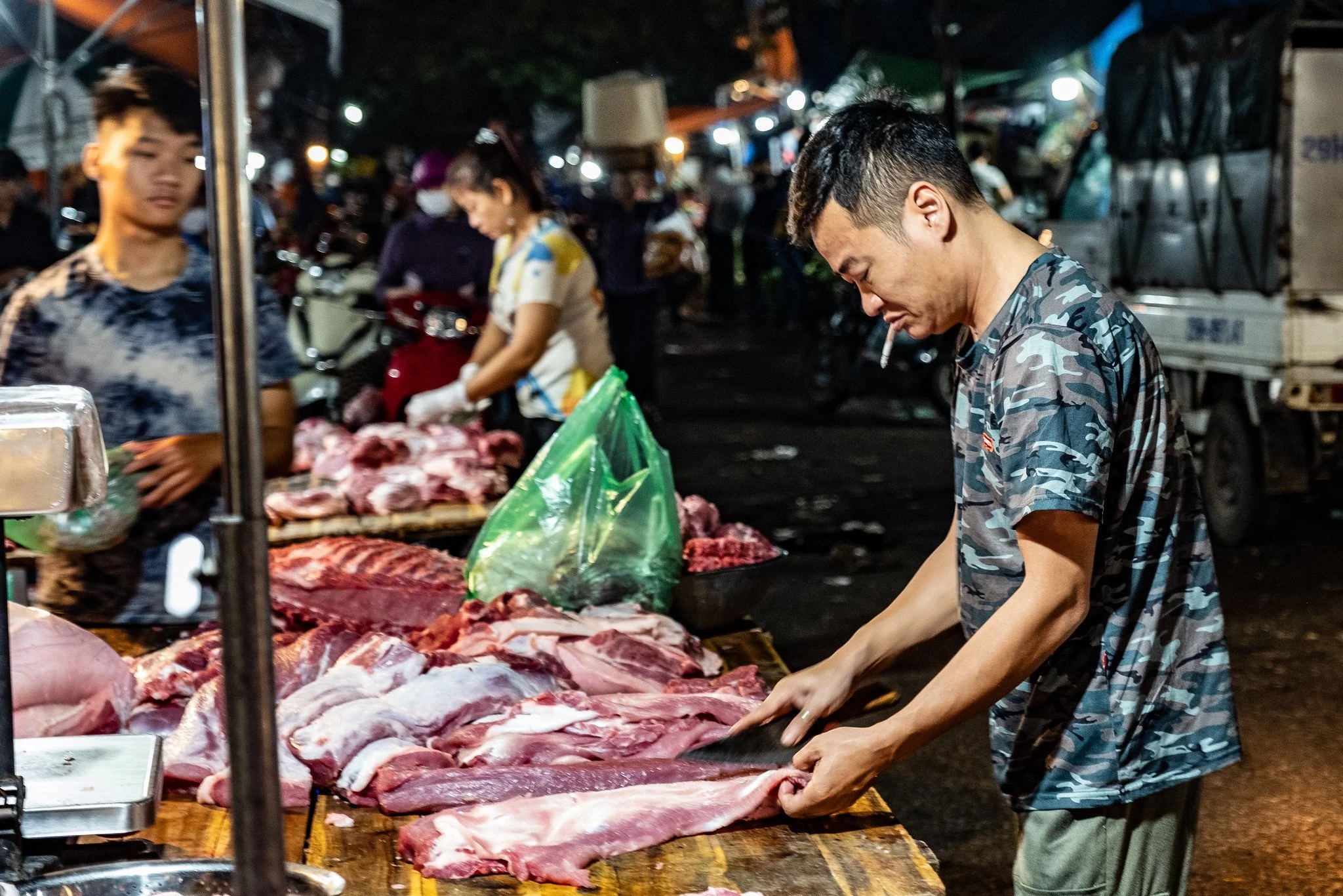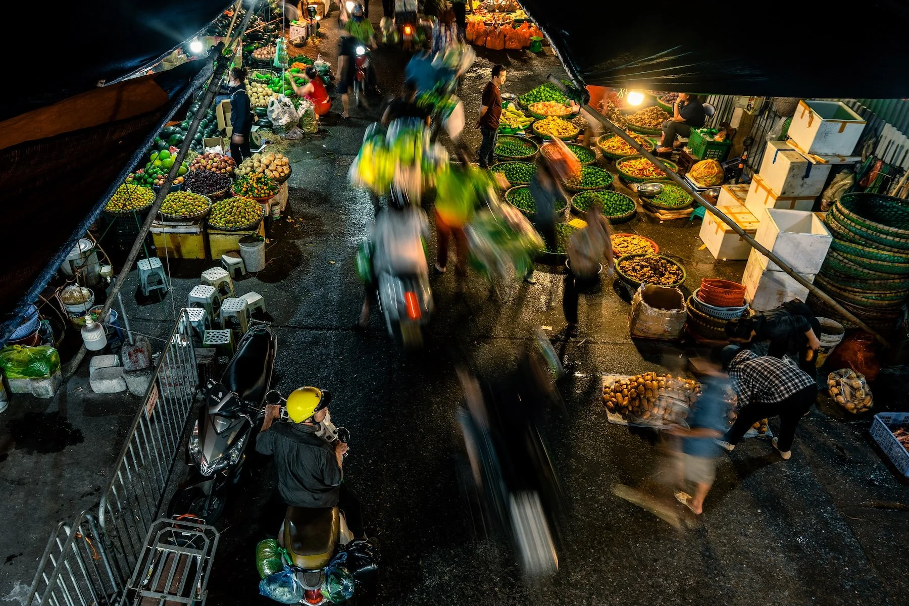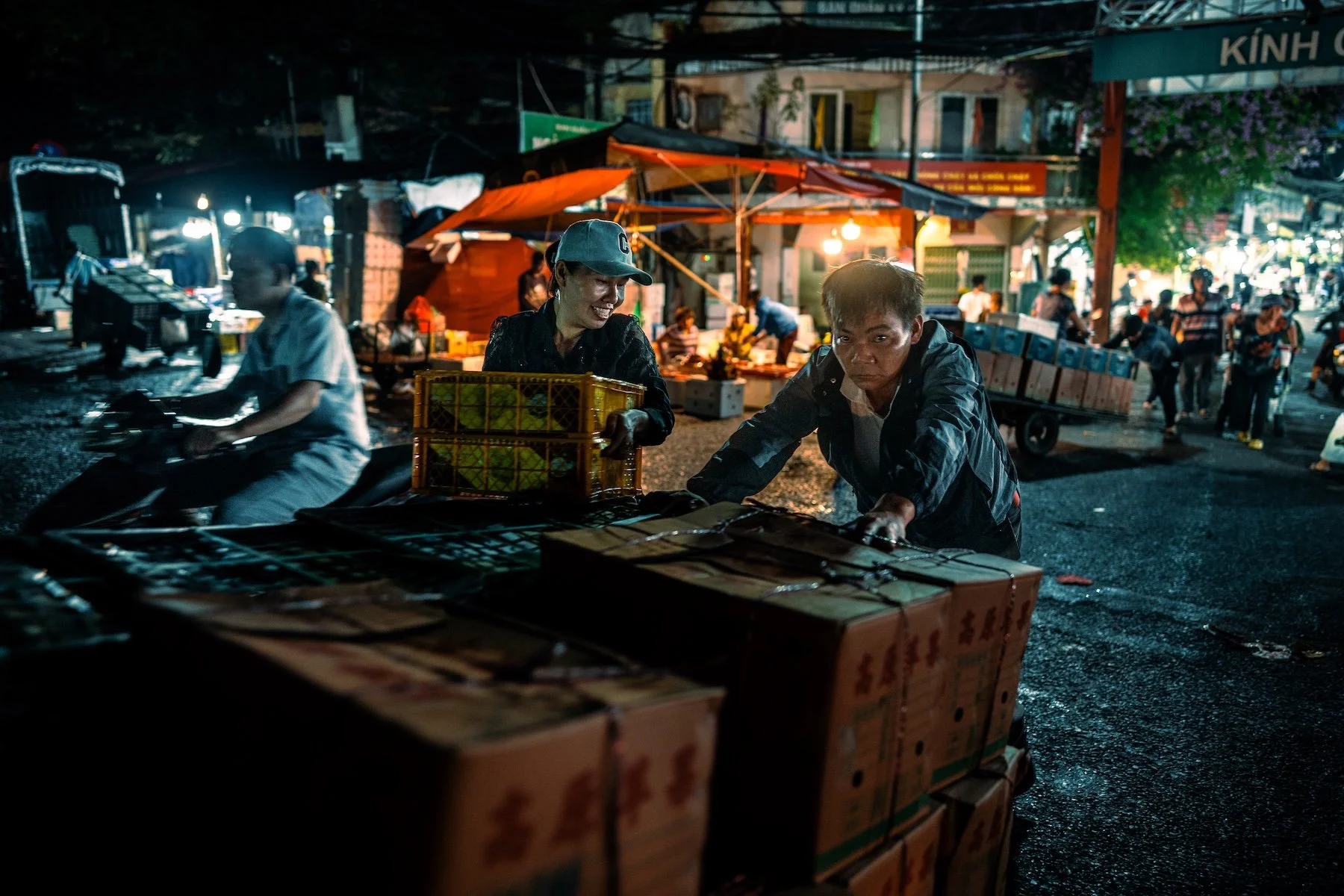 There is nowhere to look that isn't a photograph. A woman separates herbs into piles with practiced, impossible speed. A man sleeps across three stacked crates, entirely undisturbed. Somewhere nearby, something is frying and the smoke rises and mixes with the halogen light and the exhaust from a dozen motorbike engines idling in the dark.