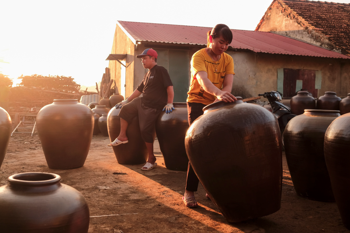 Workers move the great urns before the day's heat lifts. This is the image you make when you find the light first, then wait. © Jef Taylor / X-Pedition Hanoi 2022